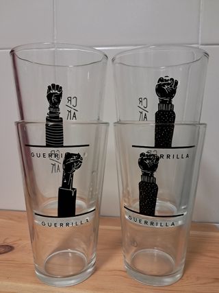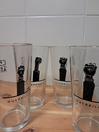 Cuatro vasos de la marca de cerveza IPA CRAK Guerrilla. Medida 15cm de alto. Uno de los vasos tiene la pintura un poco escachada.