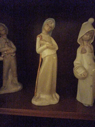Conjunto de figuras decorativas de porcelana de la marca Lladro. Representan a tres figuras con vestimenta tradicional. La de la capucha es de lladró y kas otras dos son de tito. La de la capucha tiene una reparacion. - Figuras de porcelana. - Diseño detallado. - Tonos beige y blanco.