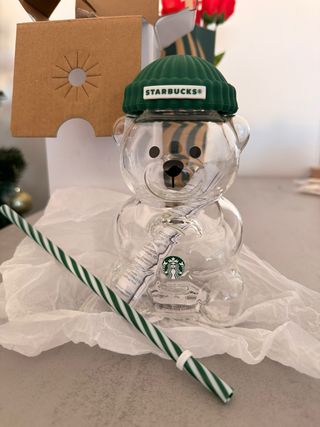 Este adorable vaso con forma de oso de Starbucks es un artículo coleccionable único. Ideal para bebidas frías. - Diseño transparente con detalles en verde. - Incluye un gorro de silicona con el logo de Starbucks. - Viene con una pajita a rayas verdes y blancas. UNIDADES LIMITADAS. No hay en tienda.