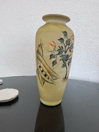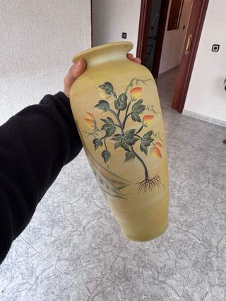 Jarrón de cerámica con un diseño floral pintado a mano. Su color base es un amarillo suave y cálido, con detalles de flores y ramas en tonos verdes, naranjas y rojos. - Diseño floral pintado a mano. - Base de color amarillo. - Ideal para decoración.
