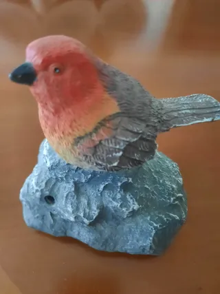 Figura decorativa de un pájaro cantor, posado sobre una roca. Con sensor de movimiento. Canta cuando detecta movimiento cerca. Está hecho de poliresina. Incluye 2 pilas AA. - Detalle de plumaje realista. - Base con textura de piedra. Medidas aproximadas. 12X10X7 Ideal para tenerlo en tu jardín interior junto a tus plantas, para dar un toque de color y alegría.