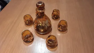 Conjunto de licorera y cinco vasos de cristal con un diseño pintado a mano. - Licorera con tapón. - Cinco vasos a juego. - Decoración floral. - Bandas decorativas amarillas.