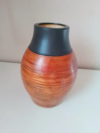 Elegante florero con un diseño único que combina cerámica y ratán. Su forma y textura añaden un toque especial a cualquier espacio. - Parte superior en color negro. - Base con acabado en tonos anaranjados y detalles lineales.