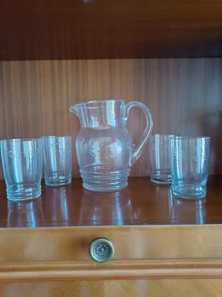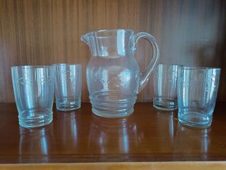 Juego de cristal tallado compuesto de una jarra y 4 vasos altos. El dibujo tallado son unas flores de 6 pétalos redondos y sus tallos y hojitas. Están en perfecto estado.