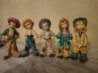 Conjunto de cinco figuras decorativas de cerámica con un estilo vintage. - Figuras de niños con ropa colorida. - Detalladas expresiones faciales. - Base estable para exhibición.