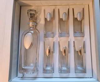 Elegante conjunto de cristal compuesto por una botella y 6 vasos con un detalle en plata ideal para grabar sus iniciales.