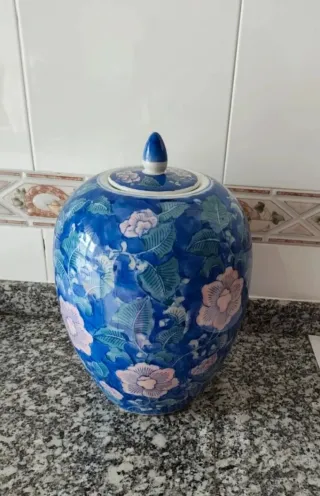Elegante jarrón de porcelana con un delicado diseño floral. - Adornado con flores en tonos rosas y azules. - Borde superior con detalles dorados. - Base con un diseño clásico.