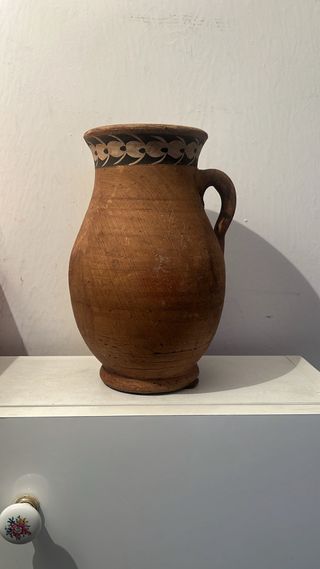 Jarrón de barro cocido con asa lateral y decoración pintada en la parte superior. Pieza decorativa de estilo rústico/tradicional, ideal para decoración vintage, casas rurales o interiores con carácter. Medidas aproximadas: Alto: 21 cm Diámetro: 13 x 13 cm Estado: Buen estado general. Presenta marcas y desgaste normales del uso y del paso del tiempo, visibles en las fotos. No tiene grietas ni roturas. Se vende tal y como se muestra en las imágenes. Entrega en mano o envío bien protegido.