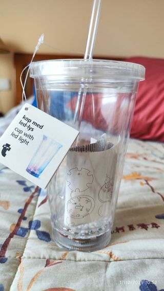 Vaso grande con un diseño llamativo y luces LED integradas. Incluye pajita y tapa transparente. Ideal para las fiestas navideñas.