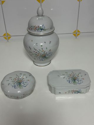Tibor y cajas de porcelana con flores