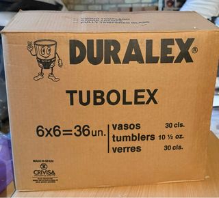 Set de 36 vasos Duralex modelo Tubolex, ideales para hostelería. Capacidad de 30 cl cada uno. Para más cantidad, se hace buen precio. - Fabricados en vidrio templado. - Diseño clásico y resistente. - Hechos en España.