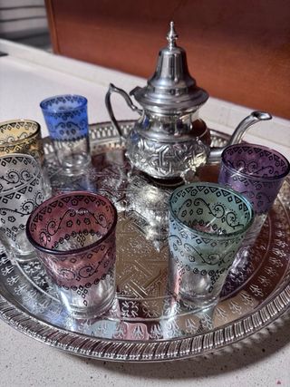 Elegante conjunto de té moruno con una tetera y varios vasos. - Tetera de metal plateado con detalles. - Vasos de cristal con diseños coloridos y plateados.