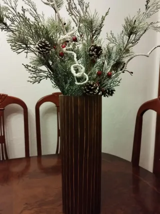 Elegante jarrón cilíndrico con un diseño vertical. - Acabado en madera con finas líneas. - Ideal para complementar la decoración de interiores.
