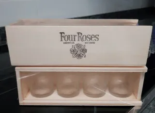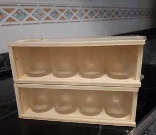 Se venden dos estuches con cuatro vasos de chupito cada uno. - Estructura de madera. - Vasos de cristal.