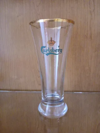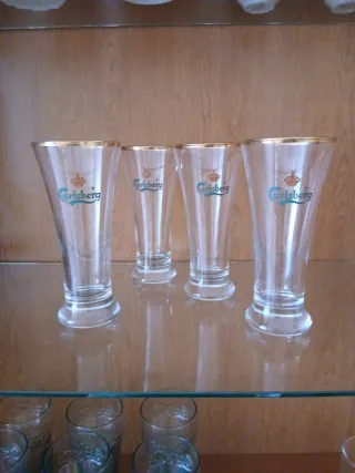 Set de cuatro vasos de cerveza Carlsberg con borde dorado. Altura 17 cm - Diseño elegante y transparente. - Ideales para disfrutar de tu cerveza favorita.