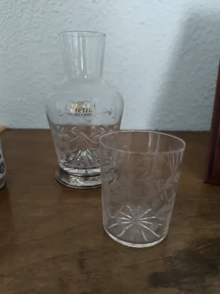 Elegante jarra de cristal de la marca Belio, con un diseño tallado a mano y vaso a conjunto. La base es de plata 20cm de altura - Diseño floral y de espigas. - Acabado artesanal.