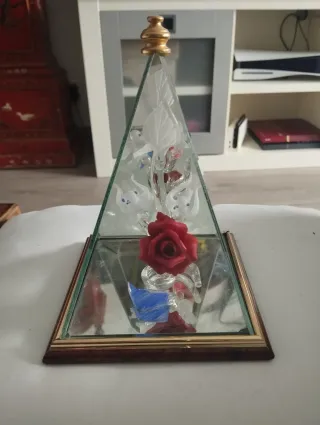 Elegante adorno de cristal con forma piramidal y una rosa roja en su interior. - Diseño tridimensional con detalles florales. - Base reflectante. - Acabado metálico en la parte superior.