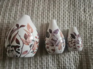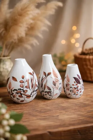 Conjunto de tres jarrones con un bonito diseño floral. - Diseño de hojas y bayas en tonos marrones y rojizos. - Acabado blanco brillante.