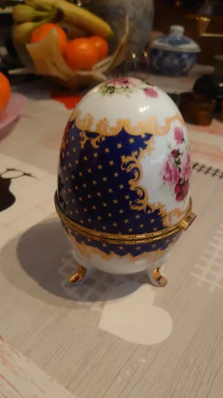 Precioso huevo decorativo de porcelana con un diseño floral y detalles dorados. - Base con tres patas doradas. - Tapa con bisagra dorada. - Motivos florales en tonos rosas y rojos. - Patrón de estrellas azules y doradas.