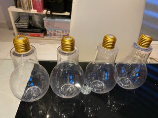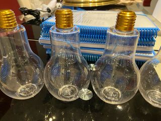 Set de cuatro vasos con diseño de bombilla. - Material: Plástico resistente. - Tapa dorada con rosca.