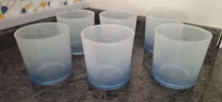 Conjunto de seis vasos con un diseño elegante y moderno. Perfectos para cualquier ocasión. Tienen pequeños desperfectos. - Diseño degradado de azul a blanco. - Fabricados en vidrio de calidad.