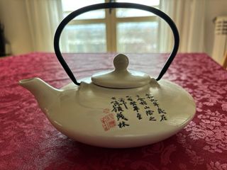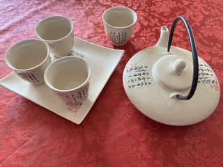Juego de té de estilo chino con escritura oriental grabada en relieve, en negro y rojo, sobre beige. Sin uso, está perfecta. - Tetera achatada muy original. Con asa de metal giratoria. - Incluye 4 tazas/vasos. - Incluye un plato donde transportar las tazas o utilizar para acompañar con algo de picar, poner las servilletas y cucharillas,... La porcelana es fuerte y al peso se percibe con calidad.