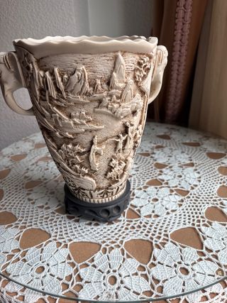 Elegante jarrón con un intrincado diseño tallado que evoca escenas paisajísticas y figuras. - Base de soporte incluida. - Detalles en relieve. - Acabado texturizado.