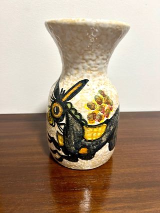 Original jarrón de cerámica con un diseño pintado a mano. - Base de color beige con textura. - Decoración multicolor con figura de animal. - Apto para uso decorativo.