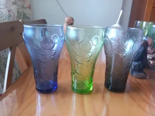 Conjunto de tres vasos con el icónico logo de Coca-Cola. - Vaso azul - Vaso verde - Vaso morado