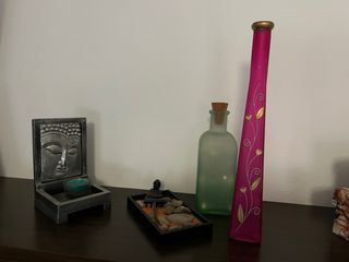 Conjunto de adornos zen para el hogar, ideal para crear un ambiente de paz y tranquilidad. - Figura de Buda con portavelas. - Mini jardín zen con figura y rastrillo. - Botella de vidrio esmerilado con tapón de corcho. - Jarrón alto decorativo con diseño floral.