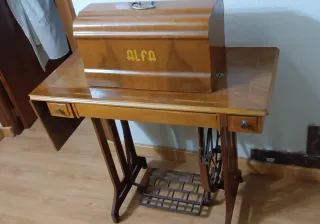 Máquina de coser antigua de la marca Alfa, con su tapa protectora de madera. - Tapa de madera con asa metálica. - Base de la mesa de madera. - Pedal de metal para accionar la máquina.