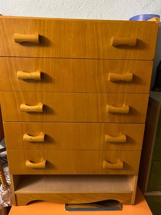 Cómoda de madera maciza con un diseño clásico y funcional. - Cinco cajones amplios. - Tiradores de madera integrados. - Espacio abierto en la parte inferior. -Medidas ancho 65, fondo 40 y alto 90cm. Le falta el último cajón. Está usada pero todavía resiste el paso del tiempo. Ideal para trasteros. Corre prisa. No cabe en coche pequeño, que no tenga asientos abatibles. Compra cualquier producto de mi perfil y te la REGALO. Recoger en Velilla de San Antonio. Madrid.