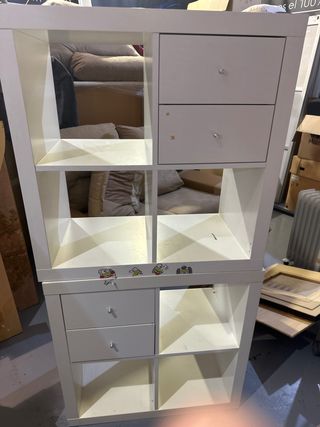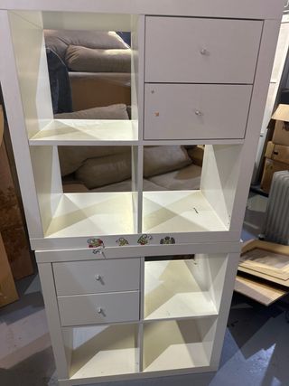 Estantería modular de diseño moderno, ideal para organizar tus espacios. - Estructura blanca. - Múltiples compartimentos. - Cajones con tiradores. - Adhesivos decorativos.