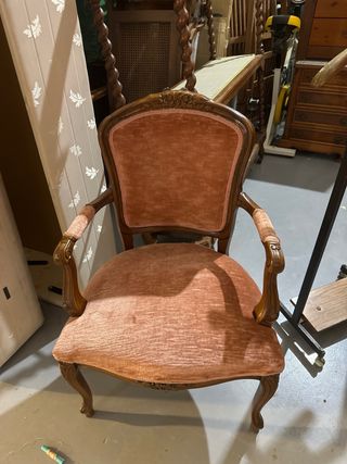 Elegante silla con tapicería de terciopelo y detalles de madera. - Diseño clásico. - Patas de madera tallada. - Brazos acolchados.