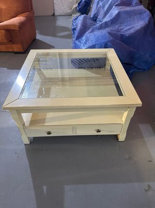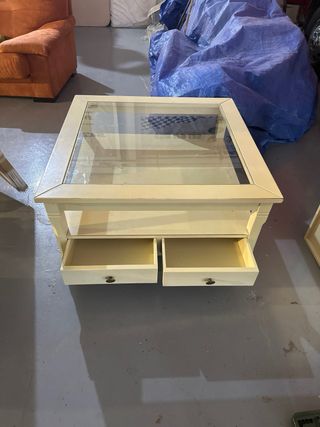 Elegante mesa de centro con superficie de cristal y estructura de madera. - Diseño moderno y funcional. - Dos cajones para almacenamiento adicional. - Acabado en color beige.