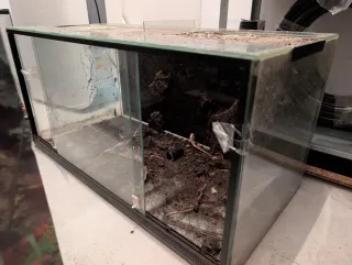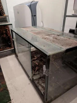 Terrario de cristal con base y tapa corredera. Está dividido en dos pero se puede quitar la separación. - Estructura de vidrio. - Puertas frontales deslizantes. - Ventilación superior.