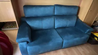 Cómodo sofá de dos plazas en un bonito color azul verdoso. - Tapicería suave de terciopelo. - Diseño moderno -Largo 1'86 Alto 1'20 Ancho 95cm Recoger en Coslada