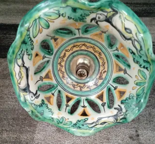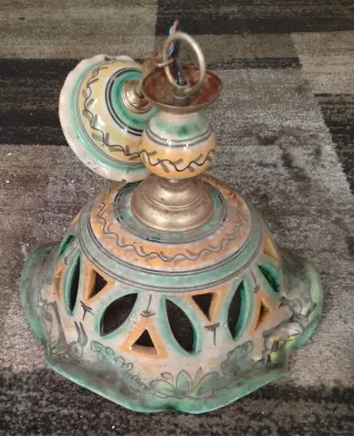 Preciosa lámpara colgante de cerámica con un diseño único y detalles pintados a mano. Su estilo artesanal la hace una pieza decorativa especial. - Base y pantalla con motivos decorativos. - Elementos metálicos en la estructura. - Diseño calado con figuras.