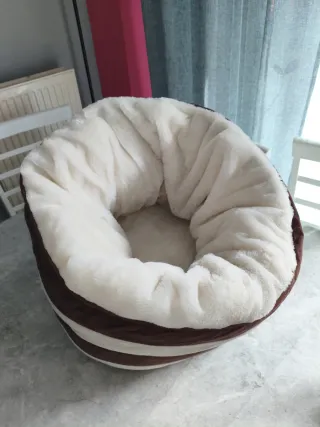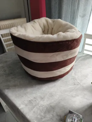 Cama acogedora para gatos o perros pequeños con un diseño de rayas. - Interior suave y mullido. - Diseño de rayas marrones y beige.