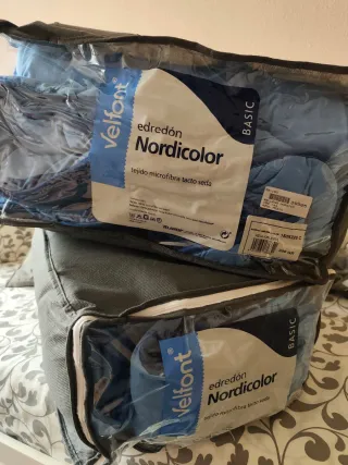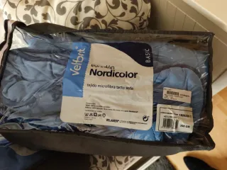 Relleno nórdico de la marca Velfont, modelo Nordicolor. - Tejido exterior de microfibra con tacto seda. - Relleno de fibra hueca siliconada. - Medidas: 150x220 cm. - Color: Azul Celeste. - Gramaje: 300 gr. - Fabricado en España.