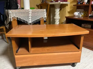Mesa de centro de madera con un diseño práctico y funcional. Ideal para complementar tu sala de estar. mesa de TV o mesa auxiliar de madera con cajón y repisa deslizante. Precio negociable - Estructura robusta de madera. - Ruedas para fácil movilidad. - Compartimentos de almacenamiento.