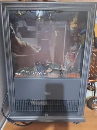 Chimenea calefactora con un diseño elegante y moderno. Añade un toque acogedor a tu hogar. Funciona perfectamente y da mucho calor el calefactor - Marco con acabado en gris y negro. - Frontal de cristal. - Base y detalles en metal y plástico.