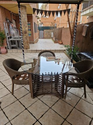 Conjunto de mesa y sillas para exterior, perfecto para disfrutar del buen tiempo. - Mesa con superficie de cristal. - Sillas con estructura de ratán. - Diseño elegante y resistente.