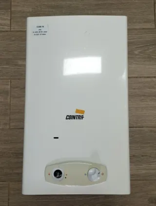 Calentador de gas butano Cointra de 10 litros. Encendido automático al abrir el grifo del agua caliente - Modelo COB-10. - Presión de gas: 28-30 mbar. - Presión de agua: 0.5-10 bar.