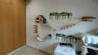 Este conjunto de juego para gatos ofrece múltiples niveles y texturas para el entretenimiento felino. - Incluye casa de madera con ventanas. - Puentes y hamacas de tela y madera. - Rascadores integrados. - Plataformas para descansar.