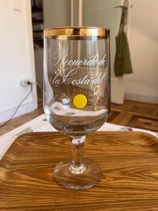 Original copa de cristal muy grande con un detalle grabado y un borde dorado. - Diseño con texto Recuerdo de la Costa del sol. - Borde superior con acabado dorado.