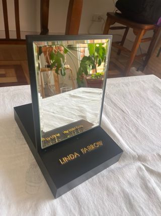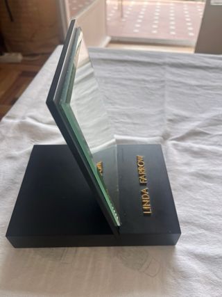 Elegante espejo de tocador con un diseño moderno. - Base en acabado negro. - Detalles dorados. - Marco del espejo en negro.