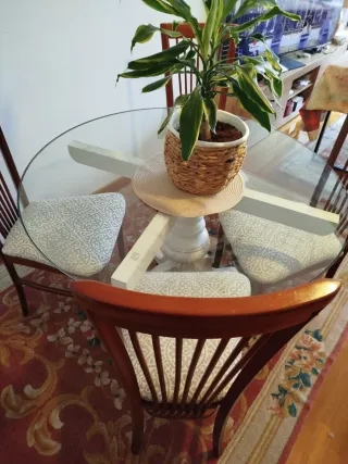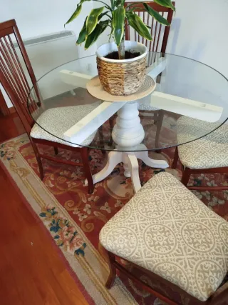 Elegante mesa redonda con superficie de cristal y base de madera. - Diseño moderno y versátil. - Patas de madera robustas.