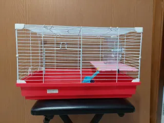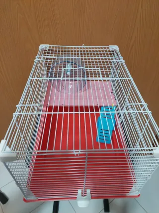Jaula para hámster con varios accesorios incluidos. Ideal para tu pequeño roedor. - Bandeja inferior de color rojo. - Estructura de alambre blanco. - Incluye rueda de ejercicio. - Plataforma interior. - Rampa azul .