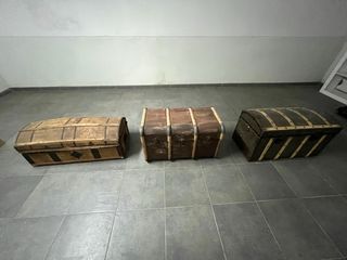 Conjunto de tres baúles con un diseño clásico y robusto. - Baúl de madera con detalles metálicos. - Baúl de madera y metal con acabado envejecido. - Baúl de madera con refuerzos metálicos.